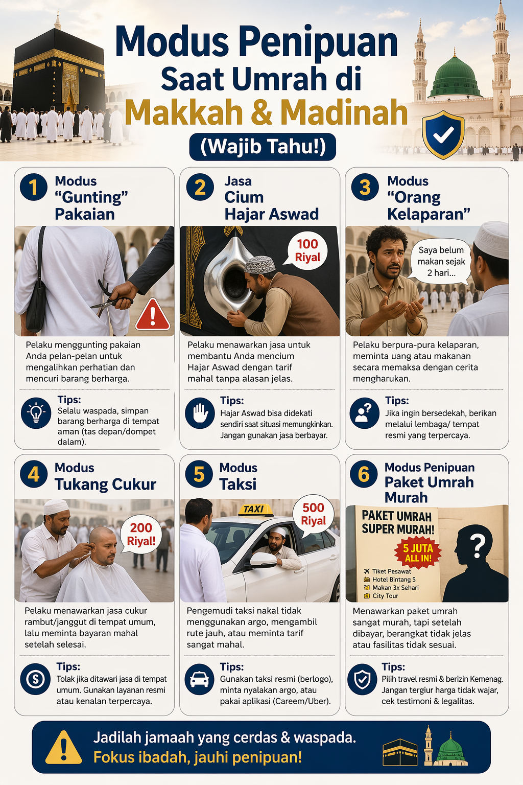 Catatan Penting: Jika Anda mengalami masalah atau merasa terancam, segera dekati aparat keamanan (Asykar) yang berseragam resmi. Mereka ada di setiap sudut Masjidil Haram dan Masjid Nabawi untuk melindungi para tamu Allah.